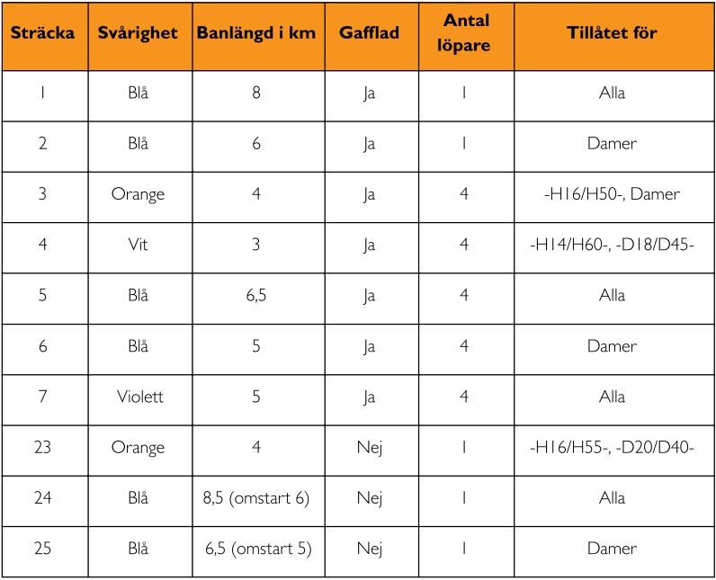 Här nedan finns en bild från inbjudan som visar längder, svårighetsgrader och vilka sträckan är tillåten för.